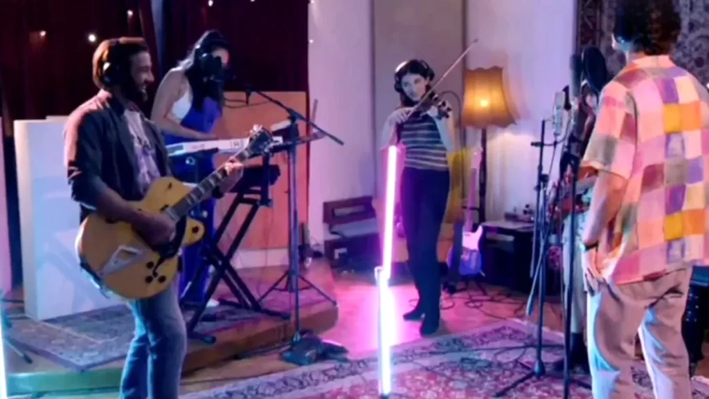 The band has seen many ups and downs since moving to Summer Bay, but they are all beaming broadly as they play their songs together, with Mercedes playing violin in support.